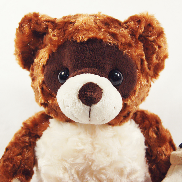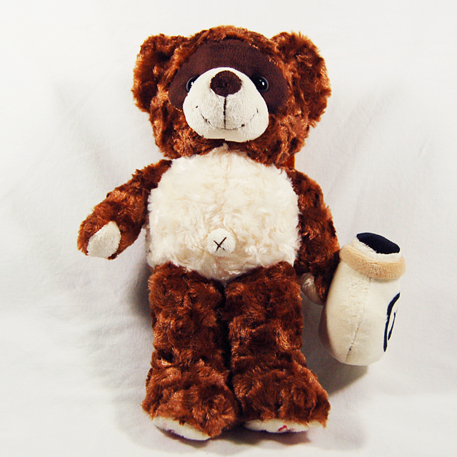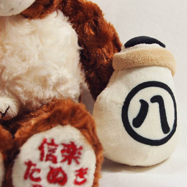 滋賀信楽たぬきベアは「編笠」を背負って、手に「徳利」を持ったたぬきのようなベアだよ!
